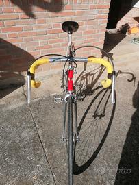 Bicicletta da corsa Moro anni 80 taglia 55, telaio acciaio Columbus che presenta qualche traccia di ruggine, monta un cambio Suntur 6 velocità con doppia corona 52/39 della Sugino con pedivelle da 170, freni modo lo è manubrio ed attacco della 3T, inizialmente montava tubolari ma poi è stata convertita a copertoncino. L'ho ripulita in questi giorni, montando dei copertoni usati giusto per fare un giro di prova, tutto funzionante.