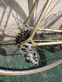 OLMO ANNI 70 CERCHI NISI IN ALLUMINIO PALMER ORIGINALI MOZZI CAMBIO DERAGLIATORE CORONA CATENA CAMPAGNOLO RECORD. POGNONE E CATENA COLOR ORO. GRUPPO CENTRALE SUGINO IN ALLUMINIO.