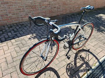 Bicicletta da corsa con telaio in carbonio Dedacciai Assoluto, ruote Fulrcrum reacing zero con cuscinetti ceramici e coperture 700x25c cambio Campagnolo Chourus a 11 velocità, piega in carbonio Deda Presa attacco manubrio in carbonio zero 100 e sella SMP Dynamic, la taglia del telaio è una L adatta ad altezze comprese tra 1,77m e 1,81m.