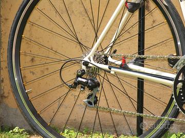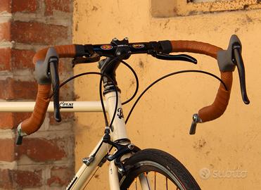 Bicicletta da corsa nuova stile retro, telaio Columbus con passaggio guaine interne misure 52x54. Doppie leve freno (posizione bassa e alta) Comandi cambio al manubrio Shimano Ultegra bar-end 8 speed. sella Brooks B17 miele Borsello Cignio, cambio Shimano 105 8v cerchi DRCCX/R PRO RACING, mozzi Novitec, Raggi neri con nippli gold.