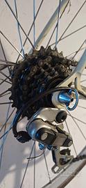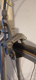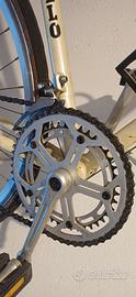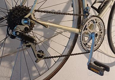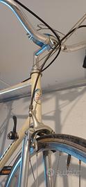 Bicicletta da corsa "vintage" marca Pinarello misura telaio 57. Telaio classico in acciaio con loghi ancora ben visibili; qualche punto di "scheggiatura" nella verniciatura compatibile con una normale utilizzo. Ereditata nella configurazione attuale con ruote sottili e componenti come da foto (alcuni chiaramente non originali). Perfettamente funzionante.