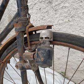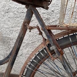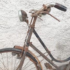 Bicicletta da donna d’epoca, marca Meazza, risalente agli anni 1930–1940, autentico esempio di ciclomobilità italiana del primo Novecento. Il telaio a scavalco basso, tipico dei modelli femminili dell’epoca, presenta linee eleganti e armoniose, oggi impreziosite da una patina originale che testimonia il passare del tempo e ne accresce il fascino storico.