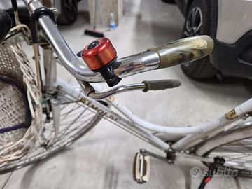 Bibicletta da donna bianca con campanello, pompa inserita, cavalletto e freni a bacchetta. Bici funzionante