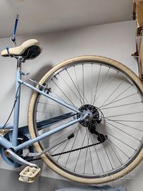 Bicicletta da donna in color azzurro con sella e coperture bianco. Usata solo 2 volte in quanto non compatibile con il portabici, per noi fondamentale per usarla al mare... A malinquore la cediamo