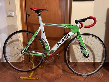 Vendo bicicletta da pista Stark Rozza, misura 54, perfetta per velodromo. Telaio aerodinamico in carbonio, design aggressivo con colorazione bianco-verde. Manubrio da pista con nastro rosso e sella abbinata. Leggera, ideale per chi cerca una bici performante.