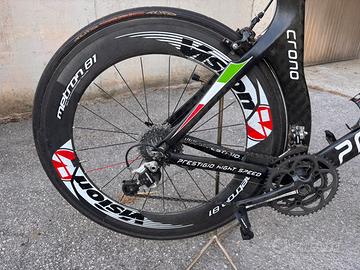 Bicicletta “Prestigio”, full carbon. Cambio campagnolo corus 11 velocità manuale. Cerchi vision da 80 in carbonio.