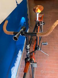 Bici in acciaio artigianale in edizione limitata con particolari in legno e freno solo posteriore a pedale, unica pecca il rivestimento del manubrio usurato dal tempo e non dall’utilizzo. Perfetta da vetrina o passeggio per chi non vuole passare inosservati!
