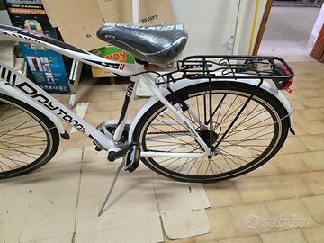 Bicicletta da città Daytona da 28 pollici in condizioni pari al nuovo, utilizzata solo in 2 o 3 occasioni. Telaio bianco leggero, cambio Shimano a 7 velocità con comando rapido e funzionamento preciso. Dotata di portapacchi posteriore, cavalletto laterale, parafanghi e sella ancora protetta dalla pellicola. Freni e meccanica in perfetto stato, nessun difetto strutturale. Ideale per uso quotidiano, spostamenti urbani e tragitti casa lavoro. Prodotto pronto all’uso.