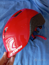 Bicicletta da bambino rosso fiammante, sportiva, a tema Cars, ruote nere dentate, manubrio e sellino regolabili, 5-8 anni, caschetto rosso in dotazione.