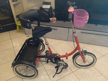Bicicletta a tre ruote, misura media per diversamente abili, con sedili protettivo e cinture, cinghie ai pedali per bloccare il piede e cestino posteriore per trasporto oggetti o borse, la bici è pieghevole e si possono rimuovere le protezioni ai pedali ed al sedile volendo