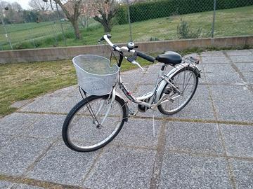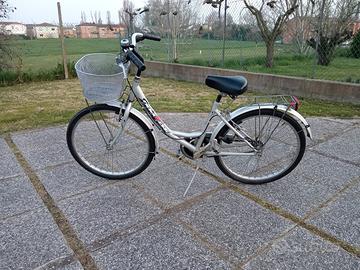 Bici donna con ruote da 24 pollici pronta per essere utilizzata, nessun lavoro da eseguire. Gomme e freni ok. Ideale per persona dalla statura contenuta o per chi preferisce sentirsi più sicuro potendo facilmente appoggiare i piedi al suolo. Completa di portapacchi posteriore, cestino anteriore, cavalletto, fanali, parafanghi e carter catena.