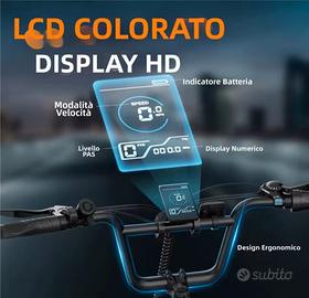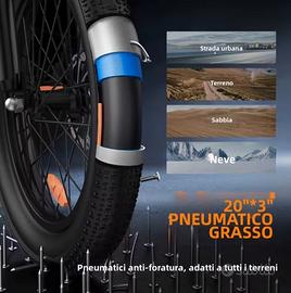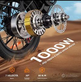 Bicicletta Elettrica 20" 1000w. Caratteristiche principali Batteria Li-ion 48V 13Ah removibile con autonomia di 50-60km in modalità assistenza alla pedalata. Ruote fat tire da 20*3" per una pedalata stabile e confortevole su diversi terreni. Freni a disco per una frenata efficace e sicura. Sospensioni a forcella anteriori che aumentano il comfort su terreni accidentati. Display LCD colorato che offre dati in tempo reale sulla guida. Far frontale luminoso e catarifrangente posteriore per una migliore visibilità. Deragliatore a 7 velocità che facilita la transizione su vari terreni. Modalità di guida: acceleratore solo, pedalata assistita e manuale.