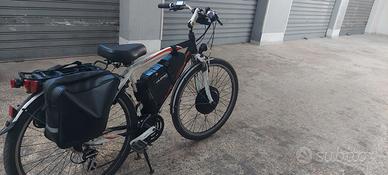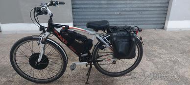 bicicletta Bottecchia verde natura trasformata elettrica,ruote da 28,copertoni SCHWALBE maraton plus praticamente impossibile forare,motore anteriore da 1000 watt,batteria 48volt 20 ampere ,borse in pelle BRN,la bici va forte,raggiunge i 60km/h dipende dal peso del ciclista,con un andamento di 25-30km/h si percorrono tranquillamente 60/70 km,