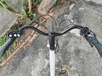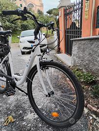 Vendo bicicletta elettrica (unisex), motore posteriore, cambio shimano, come da foto (seggiolino bimbi escluso). Vendo per inutilizzo. Praticamente nuova, usata poche volte d'estate per trasferimento casa-mare. Buona autonomia, buona reattività alla pedalata, ideale per passeggiate o spostamenti cittadini. Luce anteriore e posteriore, portapacchi, batteria estraibile (per buona conservazione). Visibile a Genova. Consegna a mano.