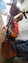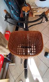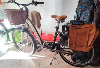 Bicicletta elettrica (e-bike) Olympia con un cestino anteriore in vimini e borse laterali in pelle marrone e batteria posizionata sul portapacchi posteriore. Pagata 1.300 €, speso 100 € per cestino nuovo, manopole, sella, revisioni varie, con carica batterie originale, con chiavi originali due, sempre tenuta in garage, ha solo la batteria da sostituire, vendo per inutilizzo, e perché ne ho altre, e ne acquisto ora di nuove. Batteria a zero da sostituire, altrimenti la tengo io e faccio sostituire la batteria in Olimpia.