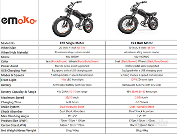 Bicicletta elettrica Emoko Modello C93, con dual motor, freni a disco, ruote grandi, display a colori. Nuova ancora nella sua scatola con garanzia 1 anno sui pezzi. Vendo per doppio acquisto. La posso spedire perchè è ancora nella sua scatola ma le spese di spedizione sono a carico dell'acquirente e comunque è meglio ritirarla di persona a Roma.