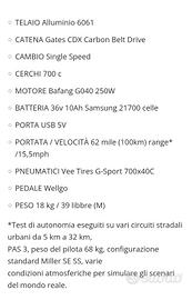 Miller SE: struttura in alluminio, leggera e potente. Batteria con 100 km di autonomia. Trasmissione Gates CDX Carbon, garantita 30.000 km. Viaggia veloce, leggero e a lungo.