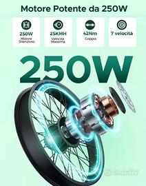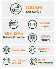 È dotata di un motore da 250 W, una batteria rimovibile da 36V 13Ah e un cambio Shimano a 7 velocità.