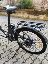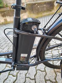 Vendo iBike City Easy S pari al nuovo, utilizzata poche volte. Vendo per cambio tipologia di bicicletta. TELAIO TAGLIA 46 cm COLORE Nero opaco e crema lucido TELAIO Acciaio FORCELLA Ammortizzata COMPONENTISTICA MANUBRIO Acciaio – tipo olandese – nero ATTACCO MANUBRIO Alluminio – fisso CANOTTO SELLA Acciaio SELLA Standard – con sgancio rapido PEDALI Polipropilene con catarifrangenti TRASMISSIONE LEVE DEI FRENI Alluminio CAMBIO A 6 velocità DERAGLIATORE Standard FRENI A disco PACCO PIGNONI Acciaio CATENA Acciaio – copri catena in plastica rigida GUARNITURA Acciaio RUOTE CERCHI Alluminio – doppia parete MOZZI Acciaio RAGGI Acciaio – spessore maggiorato COPERTURE 26″ x 1,75″ – 50 TPI PARAFANGHI Plastica TECNOLOGIA MOTORE Mozzo posteriore – 250 W – 36 V – Brushless SENSORE 12 magneti BATTERIA 36 V – 10 Ah – 360 Wh – litio DISPLAY LED – mod.810 3 livelli di assistenza – soft start IMBALLAGGIO Assemblata al 99% ACCESSORI ILLUMINAZIONE Luce anteriore e posteriore ALIMENTATORE 42 V – 2 A Portapacchi anteriore in alluminio e posteriore in acciaio Cavalletto in acciaio, campanello elettronico