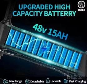 Motore e Batteria: Dotata di un motore da 250,500,1000 o 2000 w e una batteria rimovibile da 48V/15Ah, che offre un'autonomia considerevole e una velocità massima elevata.
