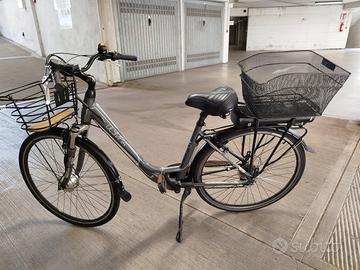 vendo bicicletta elettrica da donna ruota 28 gomme freni apposto cambio marcie funzione marca Olimpia batteria molto buono batteria 36 watt 3 modalità caricatore ha 2 chiavi Lucci avanti e indietro Funzionanti due cestini bicicletta e alluminio e leggerà no perditempo telefono nr 3496835218