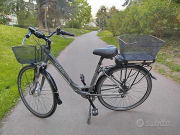 Vendo Bicicletta Elettrica da donna marca Olimpia con Ruota 28 con freni e gomme apposto e con 7 marcie funzionanti e luci avanti indietro Funzionanti con 1 cestino avanti e 1 indietro. Ha la batteria 36V ed e funzionante in ottime condizioni e ha 6 modalità di corsa e ha doppie chiavi insieme al caricatore