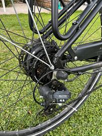 Cambio Shimano 7 velocità, freni V-Brake, display LCD con 5 livelli di assistenza e funzione walking mode, USB per carica cellulare.