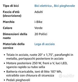 Vendo bicicletta pieghevole i-bike a pedalata assistita caratteristiche in foto nuova mai usata no scatola ne cartellino