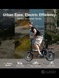 Bicicletta elettrica pieghevole AVDLEU A10 con ruote da 16 pollici, dotata di una batteria da 36 V 11,4 Ah e un motore da 250 W. Può raggiungere velocità fino a 25 km/h e ha un'autonomia di 35-50 km. Adatta sia a uomini che a donne, ideale per gli spostamenti in città.