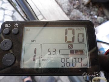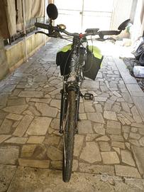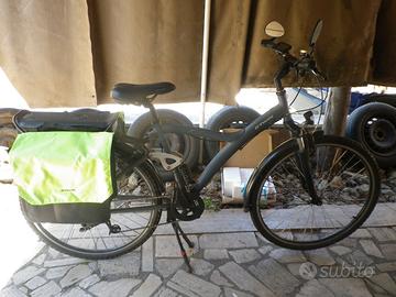 E-Bike trekking, biammortizzata BTwin Decathlon del 2020, solo 960 km percorsi, come nuova, display cristalli liquidi reteroilluminato, 90 km di autonomia a livello potenza 1 ma 50 km garantiti, batteria caricata 33 volte su 500, oltre all'allestimento base, cavalletto centrale, sacche posteriori con luci supplementari, specchietti retrovisori, rifrangenti sui raggi, campanelli vari, consiglio a ciclisti oltre i 180 cm data la misura xl