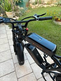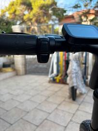 Bicicletta Engwe M20 elettrica con 2 batterie da 75km di autonomia ciascuna per un totale di 150km, velocità massima 50km/h ma regolabile con acceleratore e/o pedalata assistita, 5 marce elettriche controllabili con il display e 7 manuali. prodotta nel 2024, 1200km fatti, potenza nominale di 750 watt e potenza di picco di 1000 watt. nella parte sinistra del manico sono presenti clacson e abbaglianti, la quale luce è scheggiata, freno posteriore da avvitare un po' e sedile con un piccolo buco.