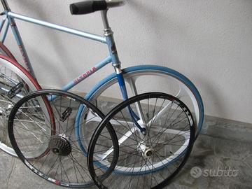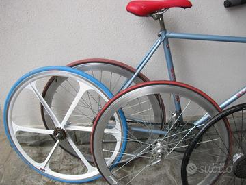 attenzione prezzo abbassato perchè cerchi bianchi con gommatura azzurra non più disponibili . Bicicletta scatto fisso uomo telaio 50x50 (gomme 23-622) , colore blu freno contropedale con 4 cerchi come in foto 2 con gommature e 2 no, euro 200 . solo ritiro diretto zona S.M.Decima . Angelo