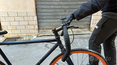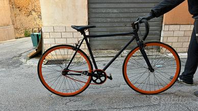 Bicicletta fixed gear / single speed urbana Bici urbana stile fixed gear, doppio sistema di frenata: - trenata a pedali (contropedale sulla ruota posteriore) - frenata tradizionale a mano Telaio in acciaio, manubrio da corsa, ruote con cerchi arancioni. Semplice, robusta e pronta all'uso, ideale per città e spostamenti quotidiani. Ritiro a mano Contattami per info