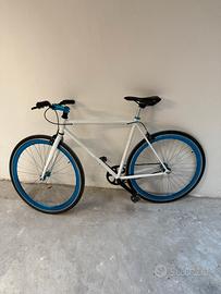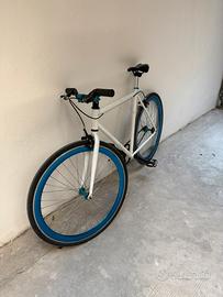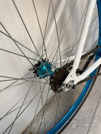 Bici a scatto fisso con mozzo posteriore flip-flop che permette di passare da scatto fisso a ruota libera. Bicicletta perfettamente funzionante! 28 pollici Peso di 10kg Cerchi in lega Telaio un po’ rigato
