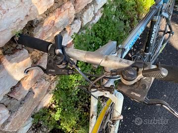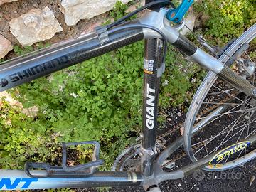 Vendo bicicletta da ripristinare, marca Giant modello Cadex 1, sella Selle Italia Flite Titanium telaio in Carbonio Kevlar, monta comandi al manubrio Shimano XT cambio/deragliatore Shimano XTR , guarnitura Shimano SG, cerchi Campagnolo e Mavic, non presente in foto ma a corredo altra forcella ammortizzata. Formula vista e piaciuta. Non vendo pezzi singoli. Astenersi perditempo. Ritiro a mano, no spedizione. Valuto permuta con Piaggio Ciao solo se con documenti.Prezzo poco trattabile.