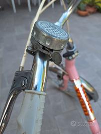 Bicicletta Graziella da bambina colore rosa, originale anni 80, marchio Vicini. Pieghevole, si apre al centro e si piega in due per essere caricata. Lo stato è buono, ha alcuni segni del tempo nei cerchioni e nel sellino. Per amatori.