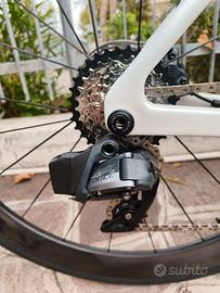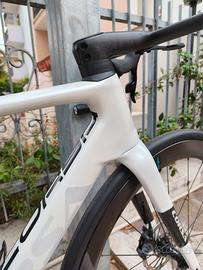 Bicicletta in carbonio marca Corsa BIKE, modello aero super light (telaio da 790gr). Taglia M/L (misura tubo orizzontale virtuale 54,5cm). Gruppo SRAM Force con misuratore di potenza, corone 48/35, pedivelle 172,5mm, pacco pignoni 10-33, 12vel. Manubrio integrato in carbonio da 120*400mm, sella Fizik Vento Open con telaio in carbonio, porta borraccia in carbonio, ruote Ryet Ultimate Ultralight (peso di 1100gr la coppia), da 50mm, con canale da 23mm e raggi in carbonio, montate con copertoni tubeless Maxxis SL e camere d'aria in TPU. Peso della bicicletta senza pedali 7,2kg. Nuova, mai usata.
