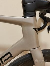 Bicicletta in carbonio, telaio Tg. 55, cablaggio totalmente integrato, manubrio in carbonio integrato (110*400), gruppo Shimano Ultegra Di2 disc 11vel, misuratore di potenza FSA Powerbox, guarnitura FSA K-Force carbon, pedivelle 172,5mm, corone 50/36, pacco pignoni 11-28. Sella Fizik Antares, Ruote Mavic Cosmic Carbon UST in carbonio da 50mm, copertoni Vittoria da 28mm. Peso circa 7,5 kg senza pedali.