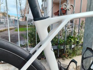 Telaio in carbonio tg.55 (Orizzontale virtuale 54,5cm). Gruppo SRAM Rival eTap AXS 12s, corone 48/38, pedivelle 172,5mm, pacco pignoni 10/33, dischi 160/160mm. Ruote in carbonio da 50mm, con copertoni da 28mm, manubrio integrato in carbonio 110*380mm, porta borraccia in carbonio. Sella con scafo e telaio monoscocca in carbonio ed imbottitura 3D. Senza pedali.