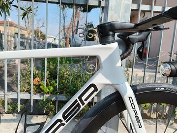 Bicicletta in carbonio marca Corsa BIKE, Taglia M/54, modello super light (telaio da 790gr), taglia L. Gruppo Shimano Ultegra Di1 12 velocità, corone 50/34, pedivelle da 172,5mm, pacco pignoni 11-33. Manubrio integrato in carbonio da 120*400mm, sella Fizik Antares R1 carbon braided con telaio e scafo in carbonio, porta borraccia in carbonio, ruote CANWIN da 50mm in carbonio, con raggi aerodinamici in carbonio (peso di 1350gr la coppia), montate con copertoni tubeless Maxxis SL e camere d'aria in TPU. Peso della bicicletta senza pedali 7,3 kg. Nuova, appena montata. Tubo orizzontale virtuale 551mm, tubo verticale 493mm, tubo sterzo 134mm, altezza sella (impostata per me) 75,5cm. Manubrio con attatda 110mm e larghezza manubrio 400mm. 7,1 Kg.