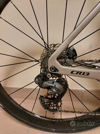 Bicicletta in carbonio, telaio Tg. 55, cablaggio totalmente integrato, manubrio in carbonio integrato (110*400), gruppo Shimano Ultegra Di2 disc 11vel, misuratore di potenza FSA Powerbox, guarnitura FSA K-Force carbon, pedivelle 172,5mm, corone 50/36, pacco pignoni 11-28. Sella Fizik Antares, Ruote Mavic Cosmic Carbon UST in carbonio da 50mm, copertoni Vittoria da 28mm. Peso circa 7,5 kg senza pedali.