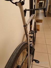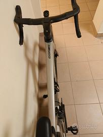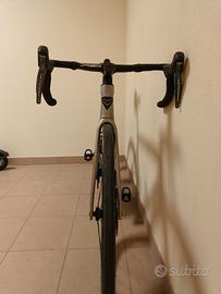 Bicicletta in carbonio, telaio Tg. 55, cablaggio totalmente integrato, manubrio in carbonio integrato (110*400), gruppo Shimano Ultegra Di2 disc 11vel, misuratore di potenza FSA Powerbox, guarnitura FSA K-Force carbon, pedivelle 172,5mm, corone 50/36, pacco pignoni 11-28. Sella Fizik Antares, Ruote Mavic Cosmic Carbon UST in carbonio da 50mm, copertoni Vittoria da 28mm. Peso circa 7,5 kg senza pedali.