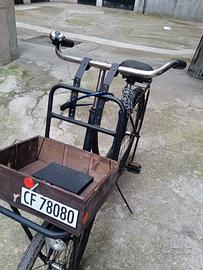 In uso presso grossa fabbrica nord Milano per spostare cose e persone. all'interno, ruote buone, da 28 pollici, veramente indistruttibile ,freno posteriore a contropedale marcato Shimano.fari anteriori e posteriori funzionanti a pila, campanello, doppio cavalletto, portapacchi posteriore ed anteriore che regge fino a 15 kg! Telaio con forma da bici olandese, pedalata fluida e silenziosa, curioso carter catena in tessuto plastico! Nessun marchio, nera opaca. decisamente unica! non pesantissima.Stimo risalga anni 80