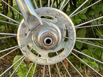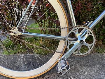 - Ruote costruite artigianalmente con cerchi a flangia alta H+Son, mozzo contropedale e mozzo Miche pista anteriore