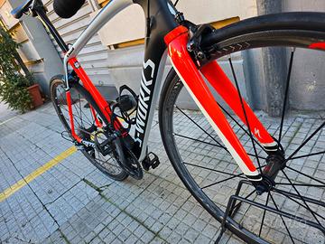 bici s-works sl5 taglia L. montata durace 9100, pedali durace 9100, ruote fulcrum racing 0 carbon completamente revisionate da fulcrum, cuscinetti ceramici nuovi e pacco pignoni durace. sella italia slr semi carbon, fornita di altre 2 coppie ruote, 1 coppia ffwd profilo 50 con pacco pignoni ultegra(circa 200km) , altra coppia bontrager in alluminio da allenamento, impeccabile in tutto
