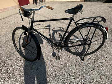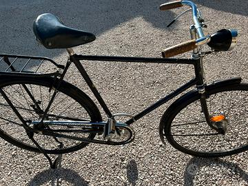 Bicicletta d’Epoca PON – Perfettamente Funzionante Vendo splendida bicicletta d’epoca PON, storico marchio olandese, in ottime condizioni generali. La bici è stata mantenuta con cura e presenta numerosi dettagli originali che la rendono un pezzo particolare e ricercato. Caratteristiche principali: ✔ Marca originale PON – Rijwielfabriek Amersfoort (visibile da targhetta sul tubo sterzo) ✔ Telaio in acciaio robusto, vernice nera in ottimo stato ✔ Parafanghi e portapacchi posteriori originali ✔ Freni a bacchetta, tipici dei modelli d’epoca ✔ Manubrio cromato con impugnature vintage ✔ Sella classica nera in stile retrò ✔ Pneumatici e cerchi in buone condizioni Perfetta sia come bici da uso quotidiano, sia come oggetto da collezione o arredamento vintage.