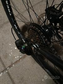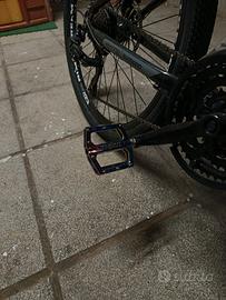 Bicicletta in ottime condizioni usata 1 mese vendo per prendere patentino, freni a disco ruota anteriore e posteriore, 18 marce varie opzioni, uniche modifiche pedali cromati in alluminio con tacchetti per non scivolare e manubrio cromato, unico problema il manubrio non ha l'attacco per la bici quindi bisogna comprarlo costa sui 20/30 euro dò anche manubrio originale con attacco e tutte le viti, gomme in ottime condizioni bisogna gonfiare. PREZZO TRATTABILE. vi aspetto.