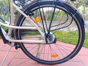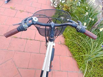 Vendesi splendida city bike da donna/unisex modello Montana Lunapiena, perfetta per la città, il tempo libero o piacevoli scampagnate. La bicicletta è in ottime condizioni estetiche e meccaniche, pronta all'uso immediato. Caratteristiche principali: Telaio: Design classico a scavalco basso (comfort entry), ideale per salire e scendere agevolmente. Colorazione crema/beige molto elegante con finiture marroni. Cambio: Sistema Shimano RevoShift a 7 velocità (comando a manopola), fluido e intuitivo, ideale per affrontare sia tratti in pianura che leggere salite. Ruote: Cerchi da 28" con pneumatici CST Traveller in ottimo stato, perfetti per l'asfalto e pavé cittadino. Sella: Sella S'Trace Italy Design, ergonomica e ammortizzata per il massimo comfort anche su lunghe distanze. Accessori inclusi: Ampio cesto anteriore in metallo nero (molto robusto). Portapacchi posteriore rinforzato con molla. Parafanghi anteriori e posteriori in tinta. Impianto luci (anteriore e posteriore) e catarifrangenti sulle ruote per la massima sicurezza. Cavalletto laterale e campanello. Protezione aggiuntiva sulla forcella anteriore. Condizioni: La bici è stata tenuta con cura, la catena è pulita e i freni sono ben registrati. Le manopole ergonomiche marroni sono in perfetto stato.