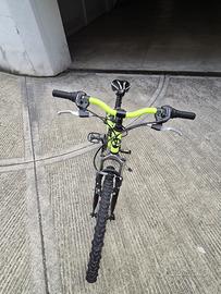 Mountain bike per bambino di 9 anni. Colorazione gialla, nera e rossa. Accesiorata con porta borraccia e luce dietro rossa. Ammortizzata. Doppia marcia.