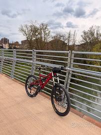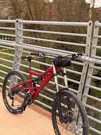 Vendo bellissima Mountain Bike da Downhill/Freeride con telaio in alluminio color rosso metallizzato, ideale per chi cerca un mezzo robusto, affidabile e pronto per affrontare i trail più tecnici e i salti in bike park. La bici presenta una geometria aggressiva e componenti di alta gamma per garantire il massimo controllo in discesa. Caratteristiche principali: • Telaio: Full suspension in alluminio, robusto e con schema di sospensione progressivo. • Forcella: Anteriore a doppia piastra (stile DH) a lunga escursione per la massima stabilità e assorbimento degli urti. • Ammortizzatore Posteriore: A molla (coil), perfetto per mantenere il contatto con il terreno anche sulle pietraie più scoscese. • Trasmissione: Gruppo monocorona con guidacatena integrato per evitare cadute della catena nei tratti sconnessi. • Pneumatici: * Posteriore: Schwalbe Big Betty (noto per l'ottimo grip in frenata). • Anteriore: Maxxis (mescola ad alta aderenza per la massima precisione in curva). • Componentistica: Manubrio Renthal Fatbar (top di gamma per ergonomia e resistenza) e freni a disco idraulici sovradimensionati. La bici è in buone condizioni estetiche e meccaniche. Sempre manutenuta dopo le uscite. Presenta normali segni di utilizzo dovuti alla disciplina (piccoli graffi superficiali che non compromettono l'integrità del telaio). prezzo trattabile